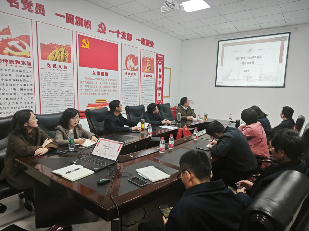 2025年11月5日下午,学院在博学楼F110会议室召开硕士生导师培训暨学科建设会,邀请浙江师范大学马克思主义学院PMA分中心主任郭金喜副教授,以在线方式做了题为“党群管理方向MPA教育的浙师实践”专题讲座,学院班子成员、学校MPA中心负责人和马克思主义学院全体硕士生导师参加,学院院长助理王晨旭主持会议。