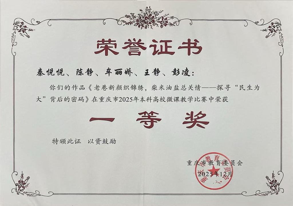 近日,重庆市2025年本科高校微课教学比赛结果揭晓。我院教师团队秦悦悦、陈静、牟丽娇、王静、彭凌提交的微课作品《老巷新颜织锦绣,柴米油盐总关情——探寻“民生为大”背后的密码》,在全市参赛作品中脱颖而出,荣获一等奖。