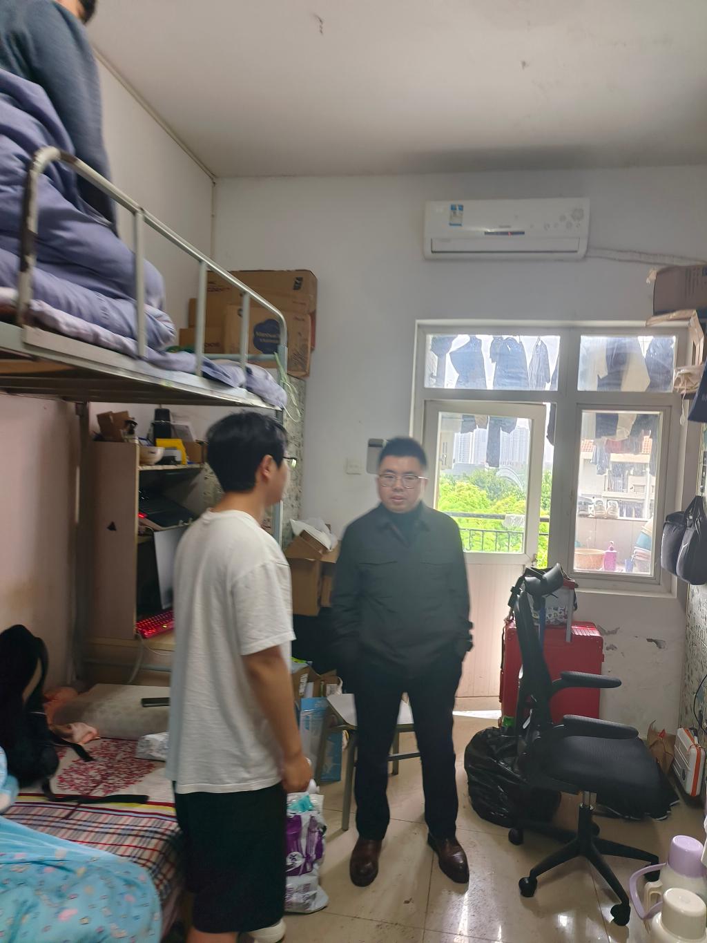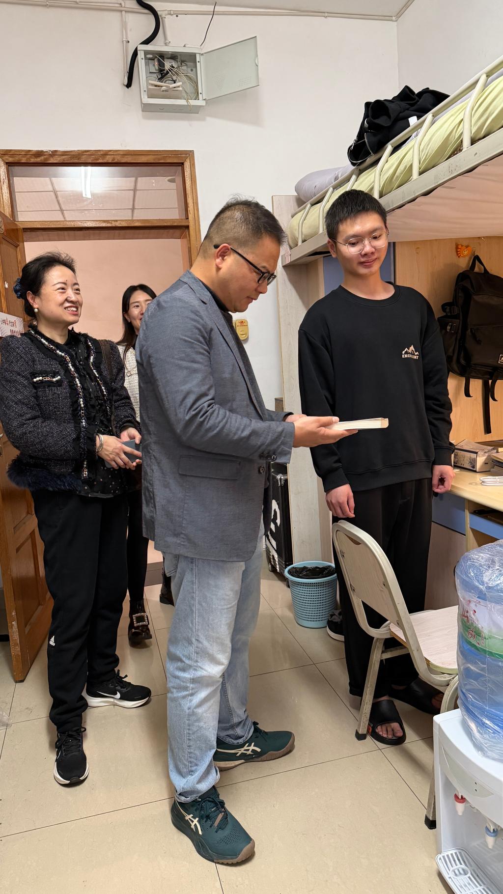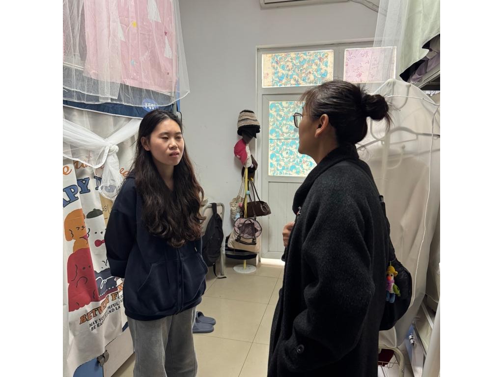 在和三组团E2402寝室,应数专业2022级学生针对个别同学习惯差,旷课多,支部党员教师重点与该同学交流,从思想上给予他鼓励,强化个人的自律,针对是毕业班,在大四的这段时间是个人锻炼,培养良好习惯的重要节点,养成好的习惯,才能在新的工作单位干好事情。老师们强调“一屋不少,何以扫天下”,并鼓励其他室友监督和帮助。