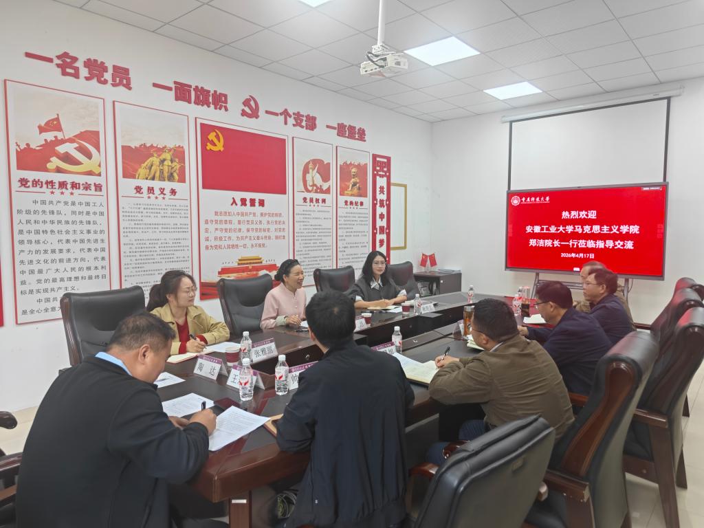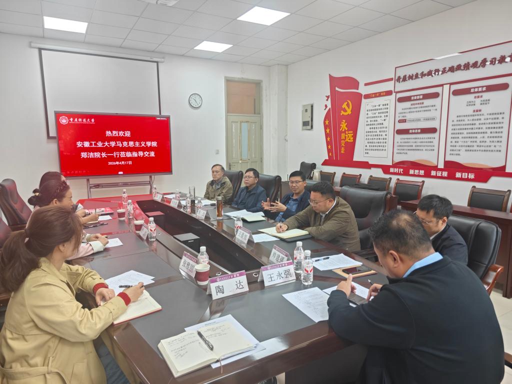 为深化马克思主义学院建设经验交流,共探思政课改革创新路径,4月17日上午,安徽工业大学马克思主义学院院长郑洁一行到访学院,双方在博学楼F110会议室举行交流座谈会。会议由学院院长张劲主持。