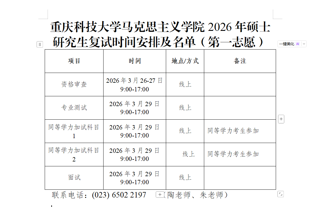重庆科技大学马克思主义学院2026年硕士研究生复试时间安排及名单(第一志愿)
