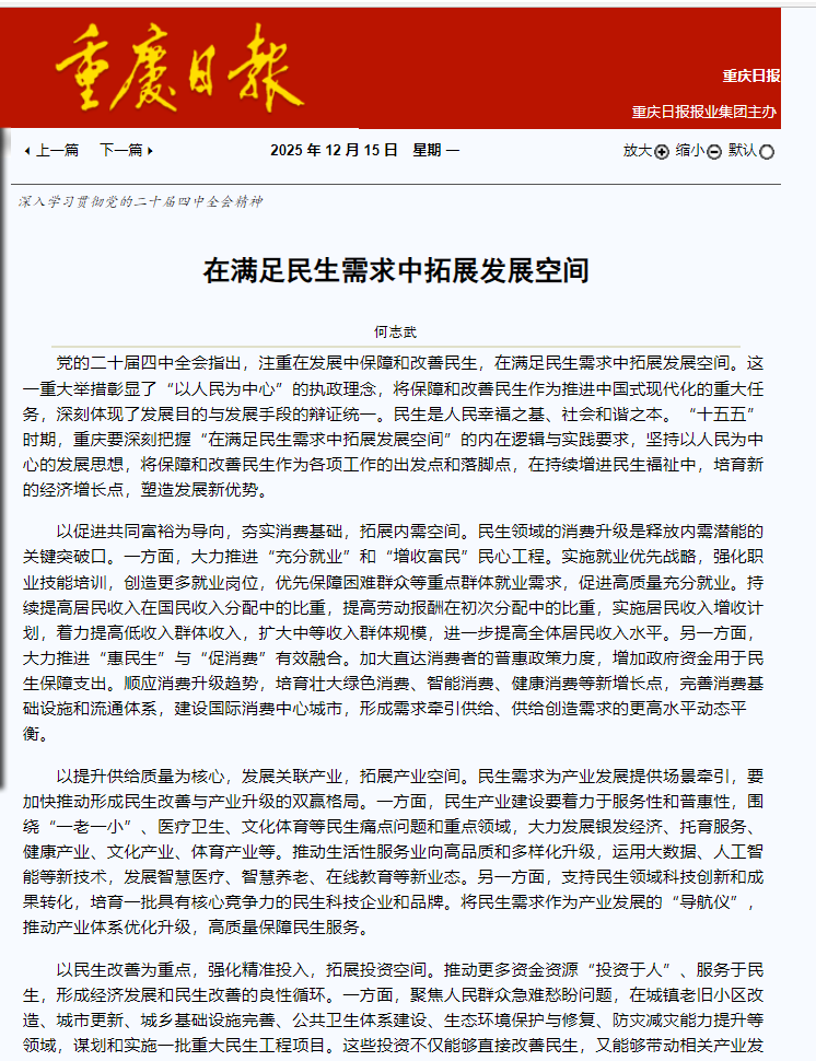 党的二十届四中全会指出,注重在发展中保障和改善民生,在满足民生需求中拓展发展空间。这一重大举措彰显了“以人民为中心”的执政理念,将保障和改善民生作为推进中国式现代化的重大任务,深刻体现了发展目的与发展手段的辩证统一。民生是人民幸福之基、社会和谐之本。“十五五”时期,重庆要深刻把握“在满足民生需求中拓展发展空间”的内在逻辑与实践要求,坚持以人民为中心的发展思想,将保障和改善民生作为各项工作的出发点和落脚点,在持续增进民生福祉中,培育新的经济增长点,塑造发展新优势。