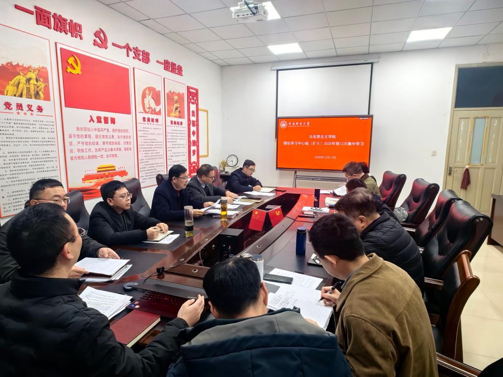 2025年12月17日上午,马克思主义学院理论学习中心组(扩大)在博学楼F110会议室召开本年度第12次集中学习会。会上学习了中央经济工作会议精神、习近平在《求是》杂志发表的重要文章《铸牢中华民族共同体意识 推进新时代党的民族工作高质量发展》、习近平在中共中央政治局第二十三次集体学习时讲话精神、习近平致中国志愿服务联合会第三届会员代表大会的贺信、习近平在广东考察时讲话精神。学院党总支书记范登龙主持会议,党总支委员、各党支部书记、教研室主任参加学习。