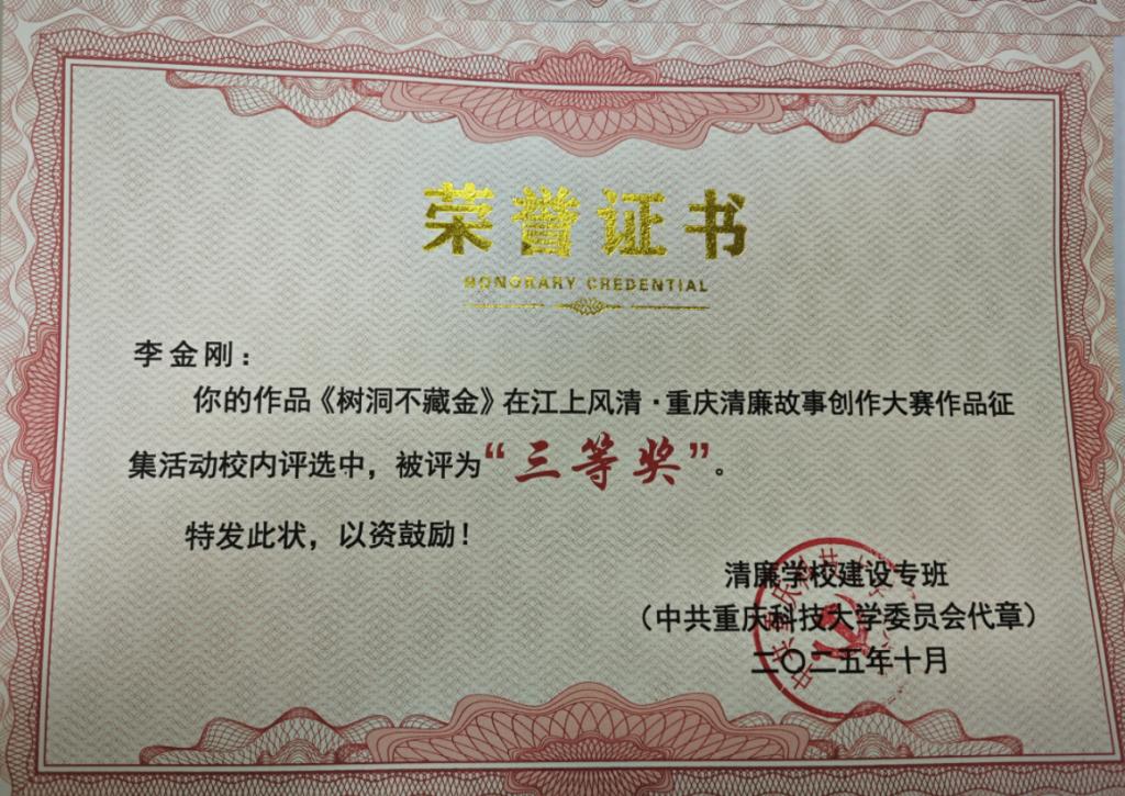 近期,从学校纪检监察室发布的《关于公布“江上风清·重庆清廉故事创作大赛”获奖作品的通知》中获悉,由各党总支推荐、经专家评审的廉洁故事创作大赛评选结果正式揭晓。在此次大赛中,学院教师表现突出,斩获佳绩:唐远华老师创作的小小说《青山明鉴》与李金刚老师创作的小小说《树洞不藏金》分别荣获二等奖和三等奖。