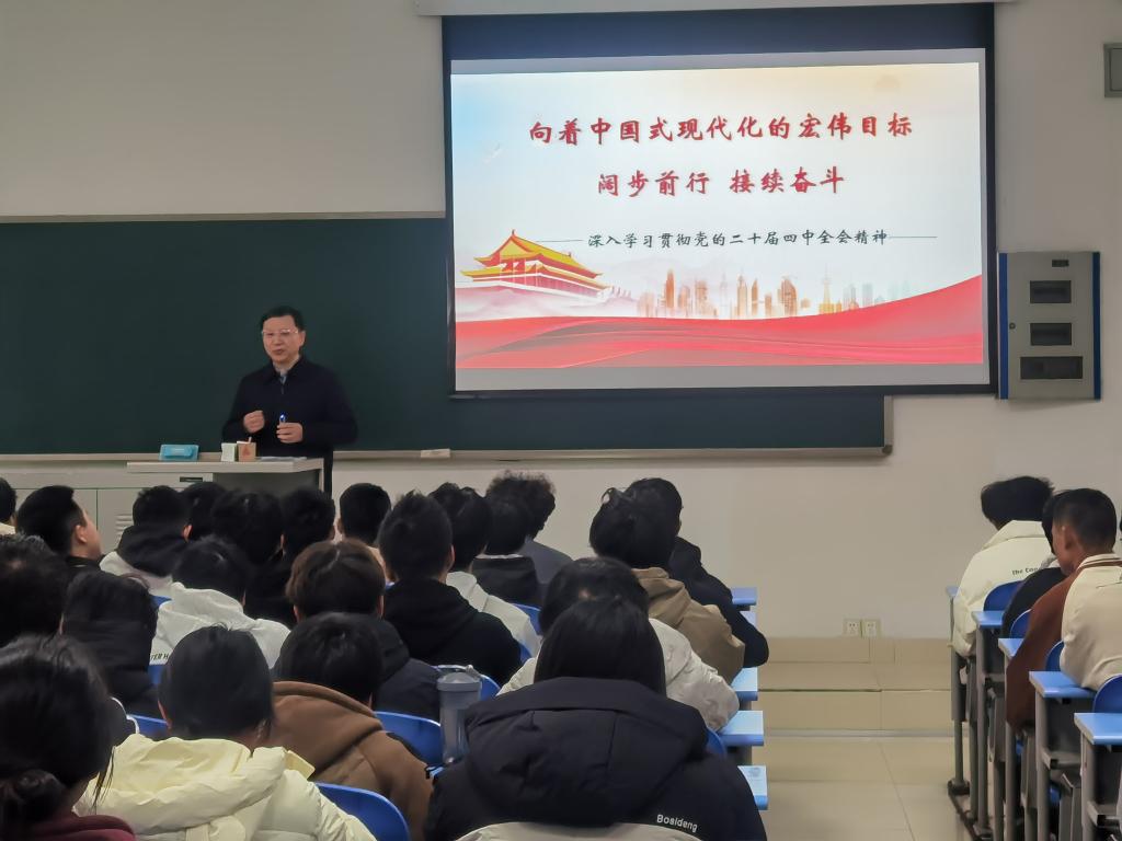 课堂上,赵明阶校长围绕“深入学习领会党的二十届四中全会精神”这一主题,从会议的重大意义、核心要义、实践要求等多个维度进行了系统阐述和深入解读。他结合自身学习体会和丰富的治校管理经验,用翔实的数据、生动的案例、平实的语言,向同学们阐释了党中央关于当前和今后一个时期国家发展大政方针与战略部署的深刻考量。